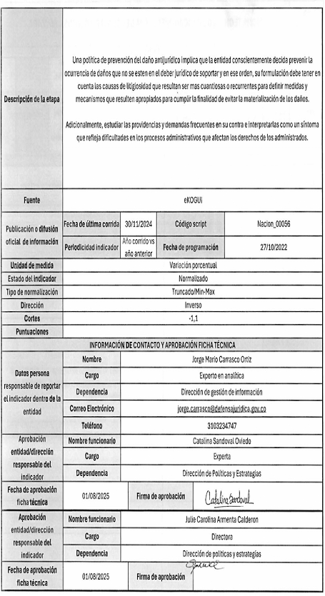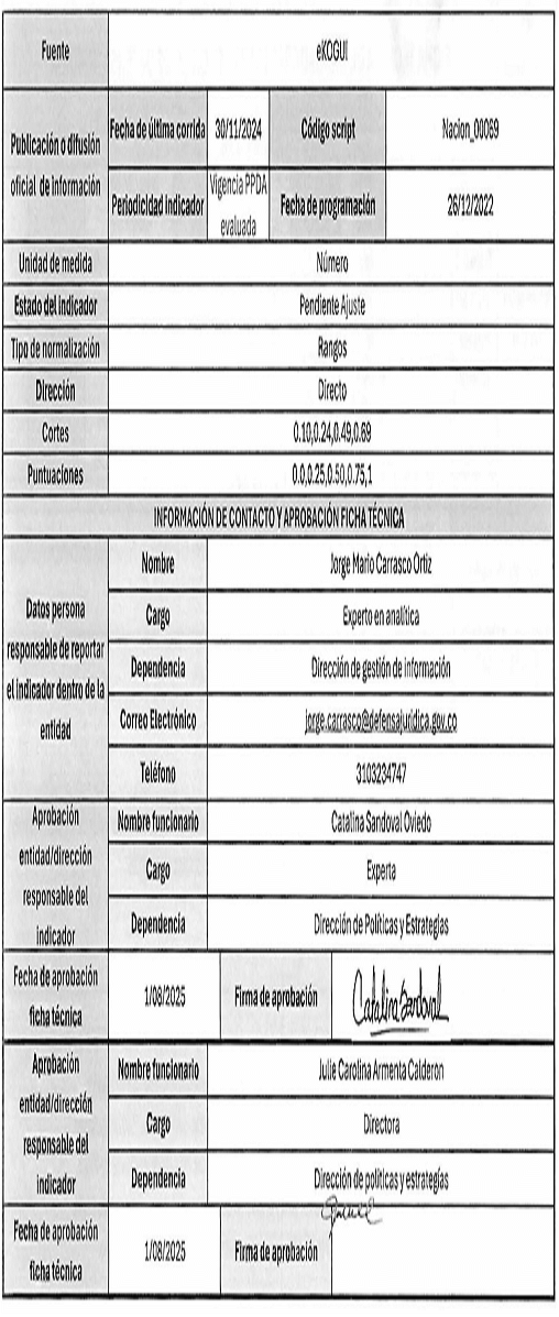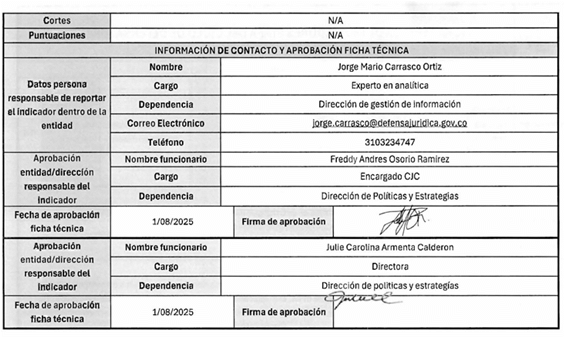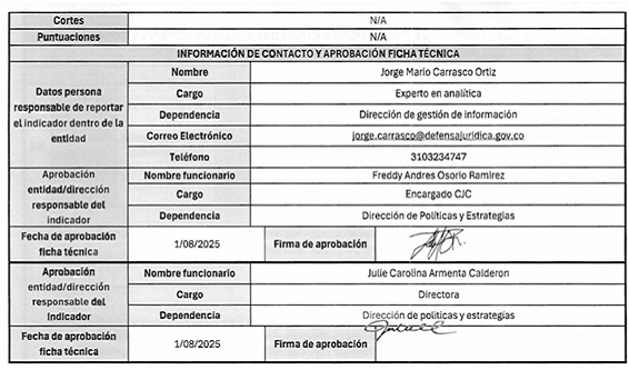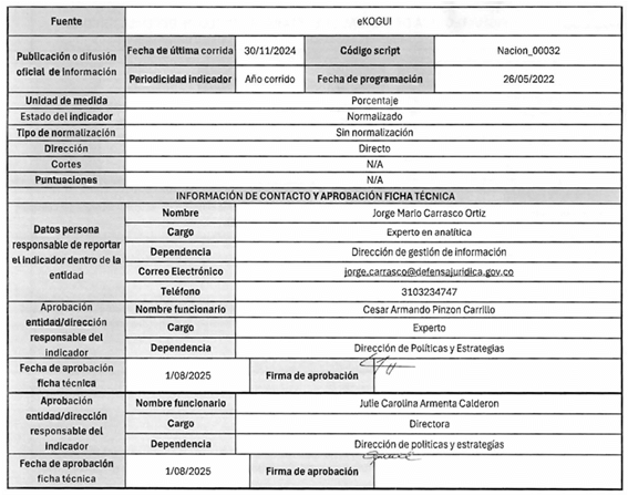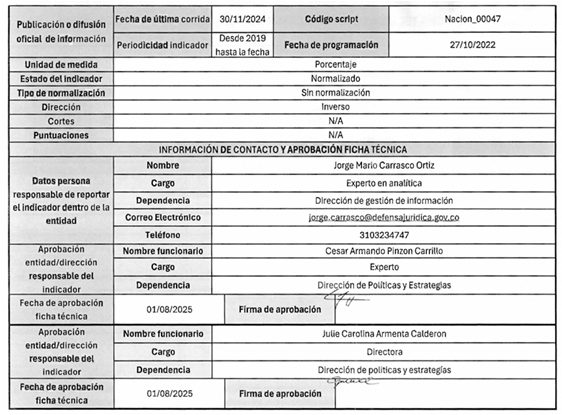 7. La ficha técnica de cada indicador detalla: (i) tipo de indicador, (ii) objetivo estratégico, (iii) descripción de la etapa, (iv) fuente, (v) unidad de medida, (vi) estado del indicador, (vii) tipo de normalización, (viii) dirección, (ix) cortes, (x) fórmula de cálculo, entre otros.