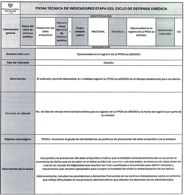 6. Los veinticuatro (24) indicadores de esta medición se distribuyen también en las distintas etapas del Ciclo de Defensa Jurídica del Estado, así: (i) tres (03) indicadores en la etapa de gestión del conocimiento, (ii) cuatro (04) en prevención del daño antijurídico, (iii) cuatro (04) en gestión extrajudicial, (iv) siete (07) en gestión de la defensa judicial, (v) cuatro (04) en gestión del cumplimiento de créditos judiciales y (vi) dos (02) en gestión de los mecanismos para la protección y recuperación del patrimonio público.
