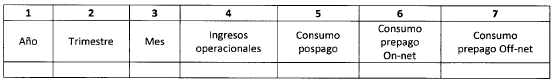 7. Consumo prepago Off-net: Corresponde al total de los ingresos en pesos colombianos (cifra completa con dos decimales) por concepto de las llamadas originadas por usuarios en la modalidad prepago y con destino a suscriptores de otros proveedores, en el mes de medición. No incluye IVA.