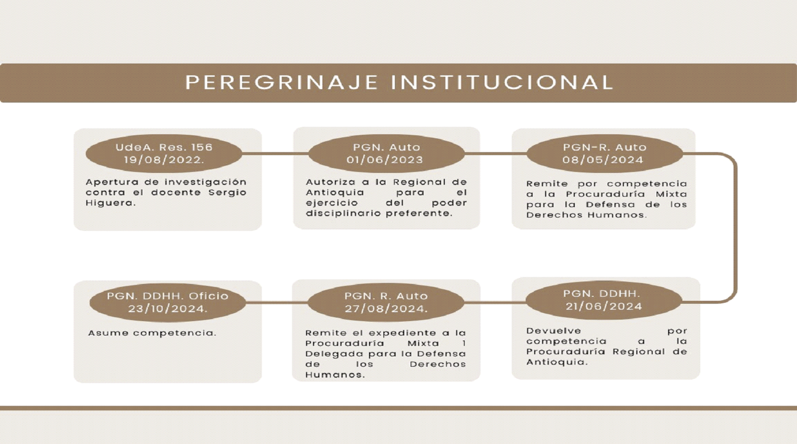 Así las cosas, el expediente ha pasado de escritorio en escritorio desde 2022 hasta hoy. De la Universidad de Antioquia a la Procuraduría Regional de Instrucción de Antioquia; y desde allí hasta la Delegada con Funciones Mixtas 1 para la Defensa de los Derechos Humanos, ubicada en Bogotá. De nuevo, de la Procuraduría Mixta 1 a la Regional y de allí, otra vez, a la Delegada Mixta 1, donde finalmente se continúa la investigación y se anuncia la preparación de un auto destinado a recoger algunas pruebas. El peregrinaje institucional es en este caso evidente, y así se refleja en la siguiente línea de tiempo: